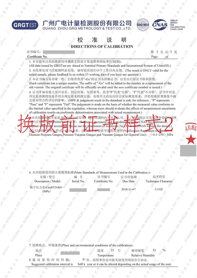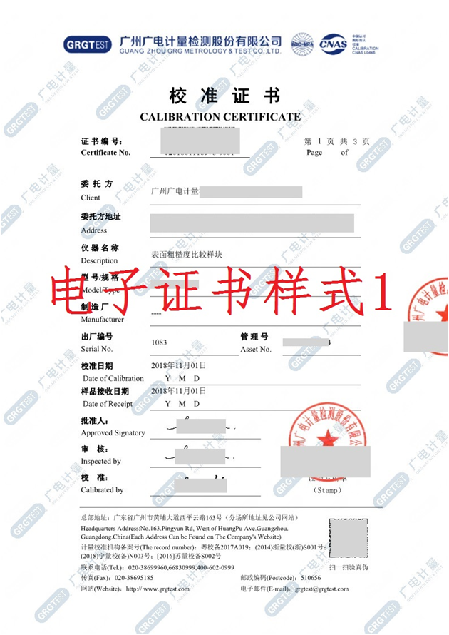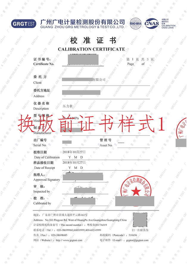 此版式證書為我司認可的正式證書,每份證書將對應唯一的編號溯源防偽,紙質證書可使用手機掃描證書封面二維碼核對封面信息辨別真偽。我司電子版證書下載渠道為 “廣電計量客戶自助服務平臺(http://120.197.59.40:8086/)”或“企業計量儀器信息管理系統(單機版)”。