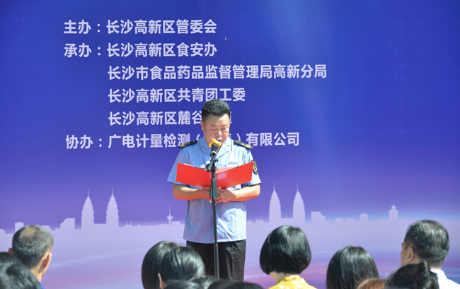 7月6日,2017年長(zhǎng)沙高新區(qū)食品安全宣傳周暨長(zhǎng)沙高新區(qū)食品安全宣傳教育基地授牌儀式,在高新區(qū)廣電計(jì)量大廈廣場(chǎng)前隆重舉行,來(lái)自長(zhǎng)沙高新區(qū)管委會(huì)、長(zhǎng)沙市食藥監(jiān)局、長(zhǎng)沙高新區(qū)食安辦、長(zhǎng)沙市食藥監(jiān)局高新分局、長(zhǎng)沙高新區(qū)共青團(tuán)工委、麓谷街道等相關(guān)政府領(lǐng)導(dǎo),攜食品行業(yè)代表及食品安全志愿者、周邊街道群眾逾300人,共同見(jiàn)證長(zhǎng)沙高新區(qū)食品安全宣傳教育基地落戶廣電計(jì)量。