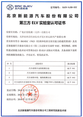 11月23日,北京新能源汽車股份有限公司(以下簡稱“北汽新能源”)在北汽新能源研究院召開了第三方實驗室證書頒發儀式。北汽新能源研究院院長及質量管理部、新技術材料部等部門領導出席,廣電計量作為北汽新能源指定的第三方檢測實驗室之一,現場被授予《第三方實驗室VOC、散發性認可證書》。