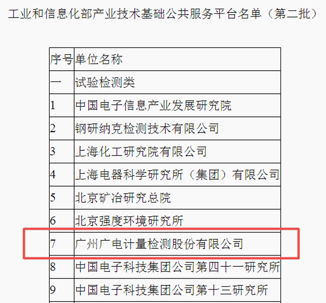 2017年12月20日,依據《工業和信息化部辦公廳關于做好2017年產業技術基礎公共服務平臺申報工作的通知》(工信廳科函〔2017〕369號),經評審和公示,確定廣電計量等17家單位列入工業和信息化部產業技術基礎公共服務平臺名單(第二批)。