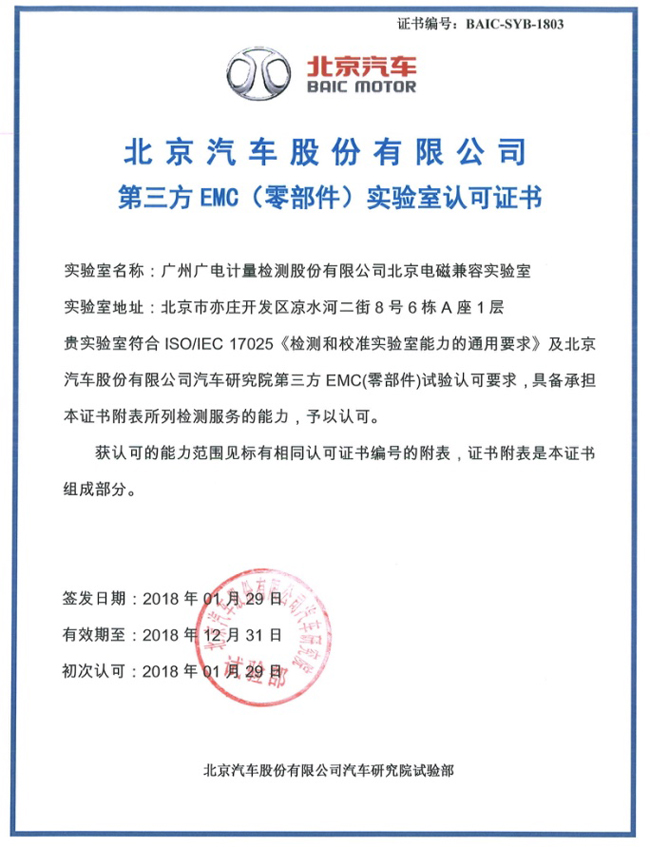 北京檢測基地電磁兼容實驗室獲得北京汽車第三方EMC(零部件)實驗室認可