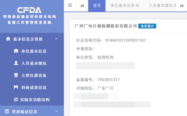 2017年10月,國家食藥監總局發布了《總局關于規范特殊食品驗證評價工作有關事項的通告(2017年第168號)》,對承擔特殊食品注冊或備案相關的產品檢驗、安全與功能驗證和臨床試驗等驗證評價工作的技術機構實施備案管理。通過該備案后,廣電計量可為特殊食品生產企業提供保健食品功效成分檢測、衛生學試驗,必要時進行違禁藥物成分檢測;提供嬰幼兒配方乳粉產品、特殊醫學用途配方食品產品的產品檢驗。