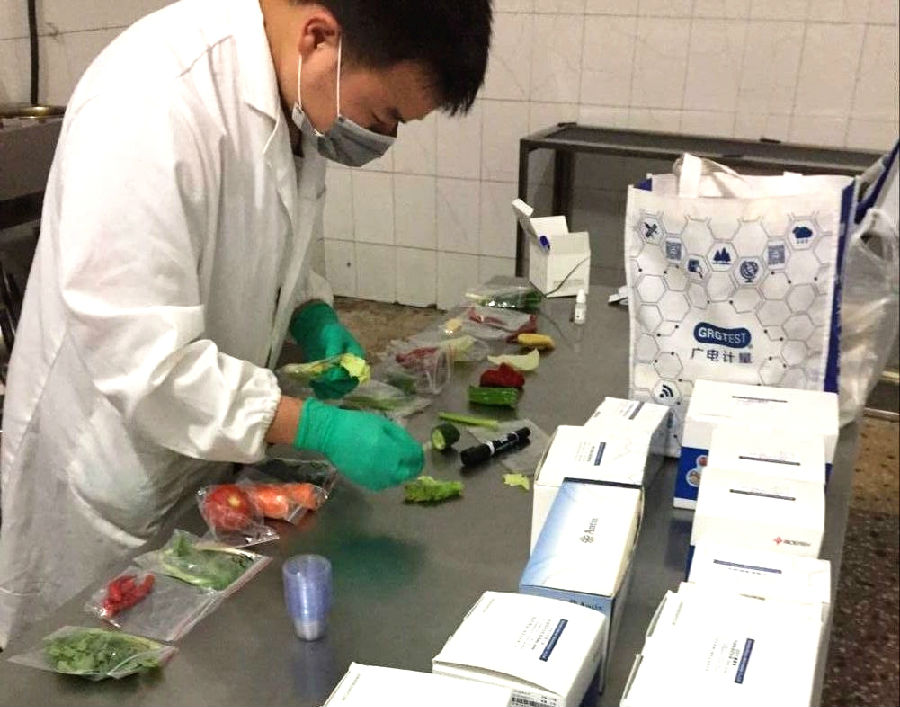 本次行動重點快速篩查蔬菜水果的農藥殘留,以及畜禽肉、鮮蛋類和水產品的獸藥殘留。為保障考生能吃上安全放心的“高考大餐”,技術人員凌晨5點半就到達考場,用不到3個小時的時間,完成了近20種食品的快速檢測工作。