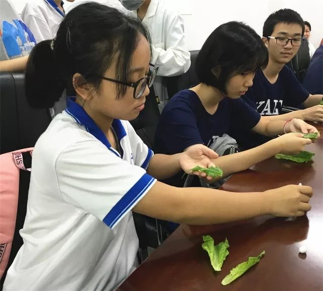 參觀完實驗室,學生們在技術人員的指引下,學習填寫食品安全抽樣檢驗單,并體驗了一把蔬菜農藥殘留的快檢過程。