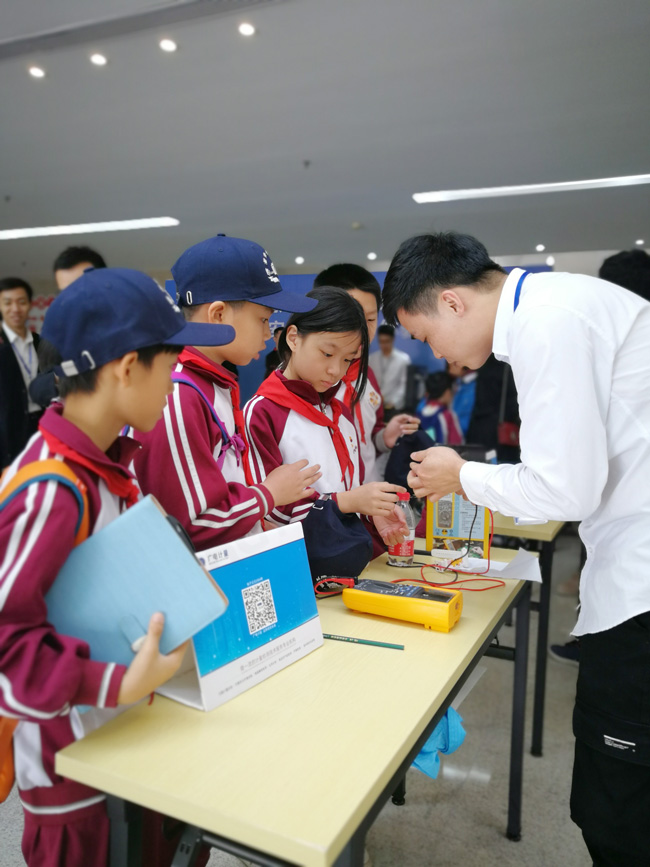 走進(jìn)互動體驗區(qū),接地氣的宣傳展板和各種有趣好玩的小實驗頓時吸引了小記者們的目光。瞬間變色實驗、火山噴發(fā)實驗、手機(jī)電磁輻射檢測……孩子們目不轉(zhuǎn)睛地盯著技術(shù)人員的操作,現(xiàn)場不時傳出陣陣驚嘆。
