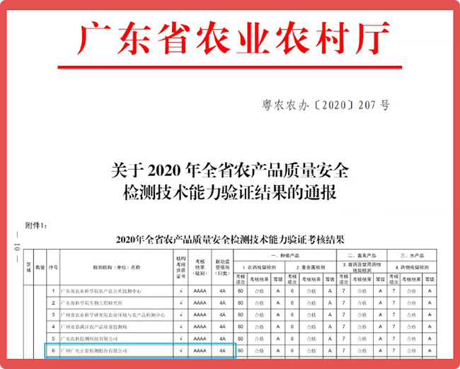 榮獲全項(xiàng)4A級(jí)!廣電計(jì)量通過(guò)廣東省農(nóng)業(yè)農(nóng)村廳2020年全省農(nóng)產(chǎn)品質(zhì)量安全檢測(cè)技術(shù)能力驗(yàn)證