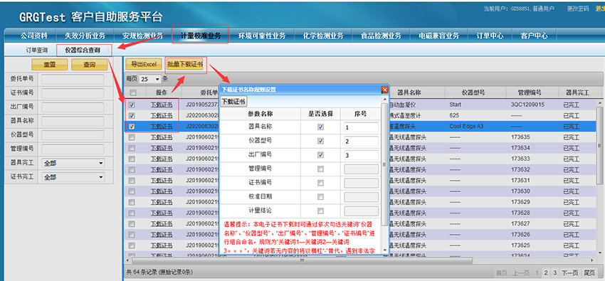 溫馨提示:客戶在進行電子證書下載時,可通過勾選“器具名稱”、“儀器型號”、“出廠編號”、“管理編號”、“證書編號”等關鍵詞對電子證書進行文件命名。
