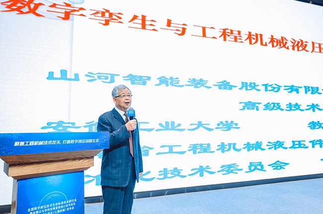 國(guó)家工程機(jī)械液壓件產(chǎn)品質(zhì)量檢測(cè)監(jiān)督中心(湖南)學(xué)術(shù)帶頭人、山河智能專家、安徽工業(yè)大學(xué)教授方慶琯作《數(shù)字孿生技術(shù)與工程機(jī)械液壓數(shù)智化》主題發(fā)言
