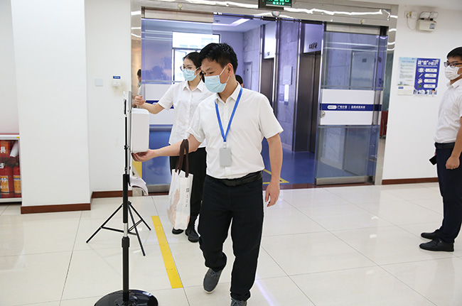 員工進(jìn)入辦公區(qū)前進(jìn)行測溫和消毒