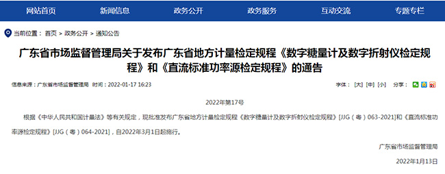 近日,廣東省市場監督管理局發布公告,由廣電計量技術質量部、計量研究院技術專家團隊編寫的JJG(粵)064-2021《直流標準功率源檢定規程》正式發布,將于2022年3月1日起施行。