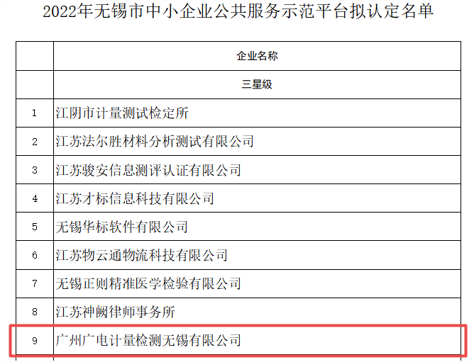 近日,廣州廣電計量檢測無錫有限公司(以下簡稱“無錫廣電計量”)連續獲得江蘇省發改委“江蘇省級現代服務業發展專項資金項目(項目名稱:高端裝備及核心部件計量檢測綜合技術服務平臺)”、江蘇省工業和信息化廳“2022年江蘇省生產性服務業優秀服務機構”和無錫市工業和信息化局 “2022年無錫市中小企業公共服務示范平臺(三星級)”三項省市級榮譽,專業技術服務能力與產業服務成果再獲政府部門認可