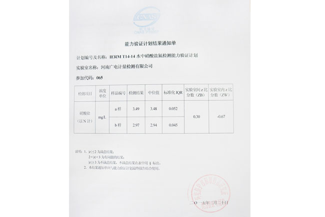 GRGT鄭州檢測基地近期收到環(huán)境保護(hù)部標(biāo)準(zhǔn)樣品研究所關(guān)于“IERM T14-14 水中硝酸鹽氮檢測”能力驗(yàn)證計(jì)劃結(jié)果通知單,結(jié)果顯示GRGT鄭州檢測基地化學(xué)分析實(shí)驗(yàn)室檢測結(jié)果全部靠近中位值,成績突出,順利通過本次能力驗(yàn)證。