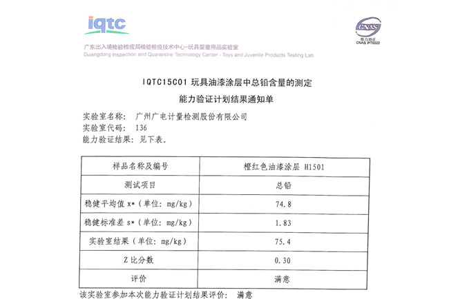 GRGT近期收到廣東出入境檢驗檢疫局檢驗檢疫技術(shù)中心關(guān)于“IQTC15C01 玩具油漆涂層中總鉛含量的測定”能力驗證計劃結(jié)果通知單,結(jié)果顯示GRGT化學(xué)分析測試中心檢測結(jié)果的Z比分?jǐn)?shù)為0.30,成績突出,順利通過本次能力驗證。