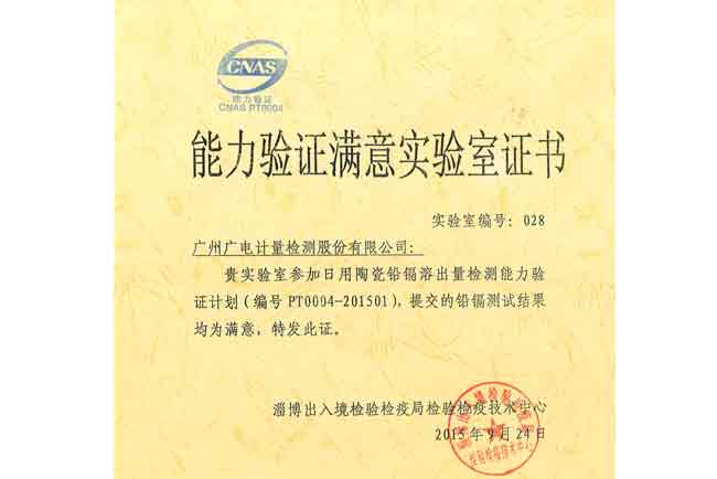 GRGT近期收到淄博出入境檢驗(yàn)檢疫局檢驗(yàn)檢疫技術(shù)中心關(guān)于“PT0004-201501 日用陶瓷鉛鎘溶出量檢測(cè)”能力驗(yàn)證計(jì)劃結(jié)果滿意證書和報(bào)告,結(jié)果顯示GRGT化學(xué)分析測(cè)試中心檢測(cè)結(jié)果的Z比分?jǐn)?shù)絕對(duì)值全部小于0.7,大于規(guī)定的小于2的要求,順利通過(guò)本次能力驗(yàn)證。