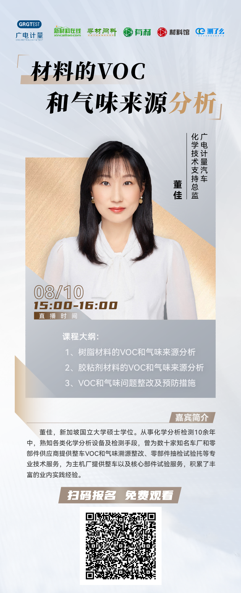 VOC(揮發性有機物)和氣味污染主要來源于產品生產過程中的原材料和添加劑,這些原料會釋放出一定量甲醛、乙醛、甲苯等有害氣體和物質。VOC含量一旦超標,不僅會產生難聞的氣味,還會對消費者的身體健康造成危害。在材料研發和生產過程中做好材料的VOC測試和氣味溯源分析,有利于實現綠色材料升級,獲得更廣泛的市場認可。為此,廣電計量與尋材問料將聯合舉辦《材料的VOC和氣味來源分析》線上公開課,為企業提供材料VOC和氣味問題的整改及預防建議,邀您參與觀看。