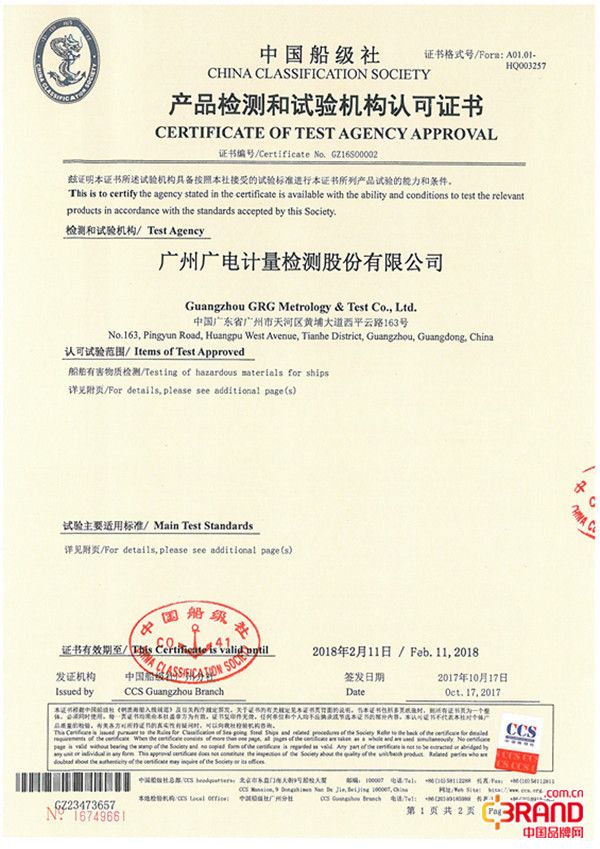 日前,廣州廣電計(jì)量檢測股份有限公司(簡稱廣電計(jì)量)先后獲得國際船級社協(xié)會核心成員、世界兩大權(quán)威船舶技術(shù)檢驗(yàn)機(jī)構(gòu)中國船級社(CCS)及美國船級社(ABS)船舶有害物質(zhì)檢測機(jī)構(gòu)認(rèn)可,成為華南地區(qū)首家同時(shí)獲得中美兩大船級社有害物質(zhì)檢測認(rèn)可的第三方計(jì)量檢測機(jī)構(gòu)。據(jù)悉,這是繼2010年廣電計(jì)量首次獲得中國船級社(CCS)電氣電子產(chǎn)品試驗(yàn)認(rèn)可及無石棉檢測認(rèn)可之后,再度獲得的船舶檢測領(lǐng)域重要認(rèn)可。依據(jù)CCS、ABS相關(guān)規(guī)范、規(guī)則和程序的要求,廣電計(jì)量通過一系列嚴(yán)格審核,順利獲得兩大船級社頒發(fā)的船舶有害物質(zhì)檢測認(rèn)可證書,這既是對廣電計(jì)量專業(yè)檢測技術(shù)能力的進(jìn)一步肯定,同時(shí)也將推動廣電計(jì)量在 “綠色造船”進(jìn)程中發(fā)揮更積極的作用,為我國打造綠色健康船舶業(yè)再添檢測技術(shù)動力。