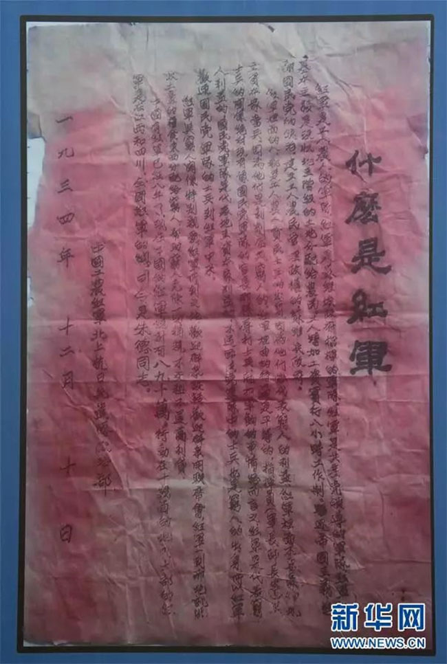 這是一張歷經(jīng)烽火歲月的宣傳單,如今上面的字跡依然清晰可辨。“長征是宣言書,長征是宣傳隊(duì),長征是播種機(jī)。”這張《什么是紅軍》的宣傳單,15行、不足500字,語言通俗易懂,將紅軍的宗旨、任務(wù)及有關(guān)政策,闡述得一清二楚。