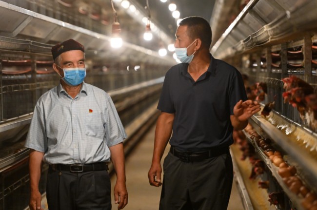 在新疆伊寧縣溫亞爾鎮(zhèn)布力開村玉林禽蛋養(yǎng)殖專業(yè)合作社,買買提江·吾買爾(左)與養(yǎng)殖戶交流。丁磊攝(新華社)