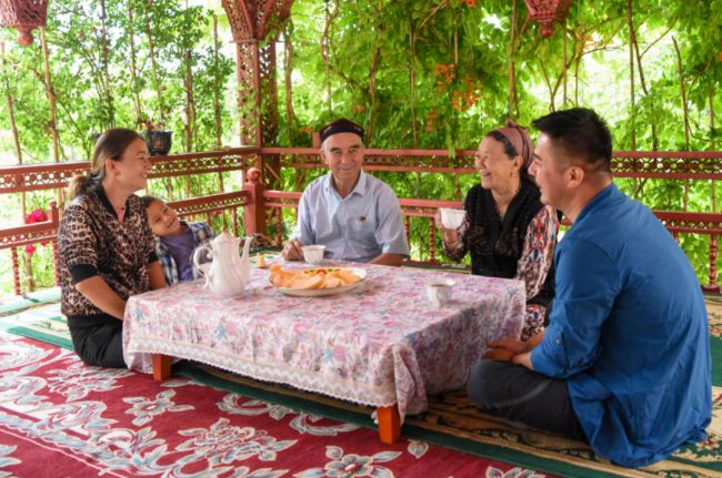 在新疆伊寧縣溫亞爾鎮(zhèn)布力開村,買買提江·吾買爾(中)一家人在聊天。丁磊攝(新華社)