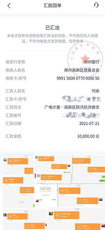 7月20日,河南子公司黨支部第一時間成立以支部書記為組長的汛期安全保障小組和黨員防汛先鋒隊。7月21日,河南子公司黨支部書記劉余以個人名義,向鄭州高新區慈善總會捐贈防汛抗洪救災款10000元。7月22日,當了解到鄭州福利院缺乏物資,廣電計量河南子公司黨支部迅速行動,積極發動廣大黨員自愿捐款,聯同“黨建+”項目獎金,購買大量牛奶、面包等重要民生食品物資,第一時間送往鄭州福利院,用涓涓愛心匯聚成一股救災正能量,幫助受災群眾度過難關。