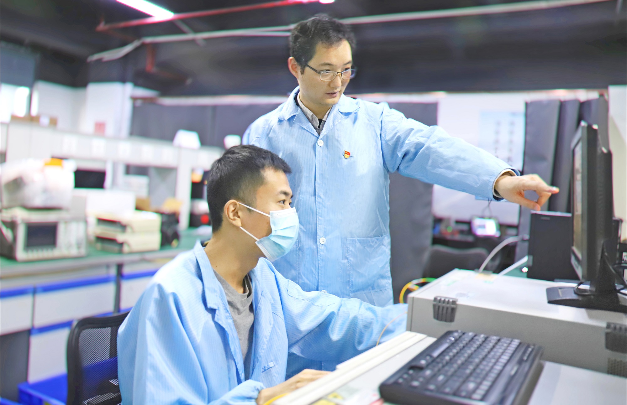 張輝在實驗室指導同事進行光通信校準測試