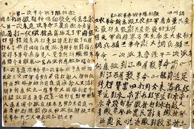 “第一、二次革命戰爭勝利歌”手抄卷,長方形,毛邊紙,黑墨毛筆字橫寫,古田會議紀念館館藏,國家三級文物。兩首歌、三張紙并列粘貼在有機板上,左邊一張為“第一次革命戰爭勝利歌”,另兩張為“第二次國內革命戰爭勝利歌”,內容較長。